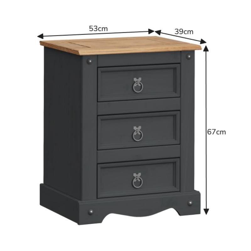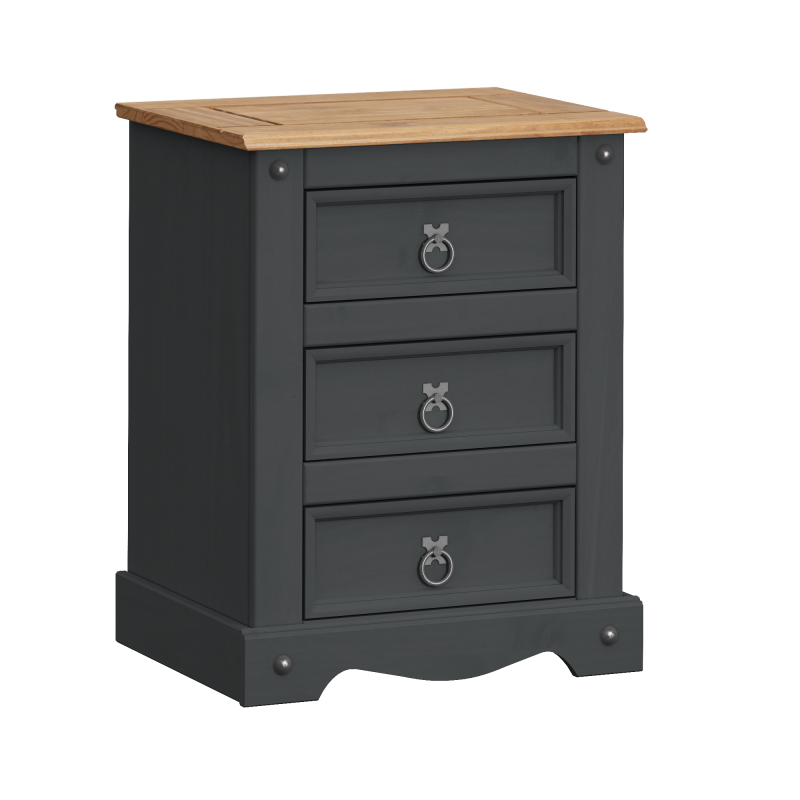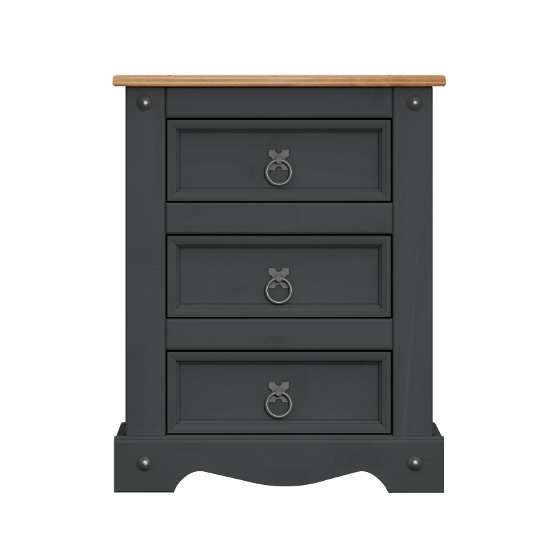 Add practical bedside storage with rustic charm using the Mercers Furniture Corona Charcoal Large Bedside Cabinet. Finished in a stylish charcoal colour with a contrasting solid pine top, this piece blends the classic Corona design with a modern look that suits both traditional and contemporary bedrooms. Featuring three spacious drawers, it provides plenty of storage for everyday essentials such as books, chargers, and personal items, while the generous top surface is ideal for a lamp, alarm clock, or decorative accessories. The distinctive gun metal ring handles and decorative studs complete the signature Corona style. Crafted from solid pine, this bedside cabinet is both sturdy and durable, making it a practical and stylish addition to any bedroom.
